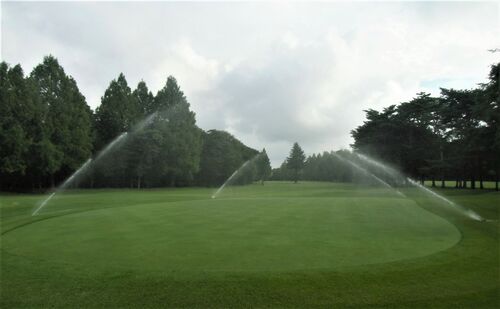 まだまだ暑さが続いておりますね。 コース作業の早朝の散水風景です。 この時期、最も重要な作業のひとつです。グリーンの刈り込み前に行っております。 スプリンクラーで散水して水量が足りない所は、スポット散水をタンク車か、ホースにて散水をします。少…