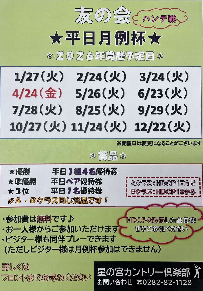 2026年の平日月例杯の日程が一部変更となりました。【4/28(火)→4/24(金)】